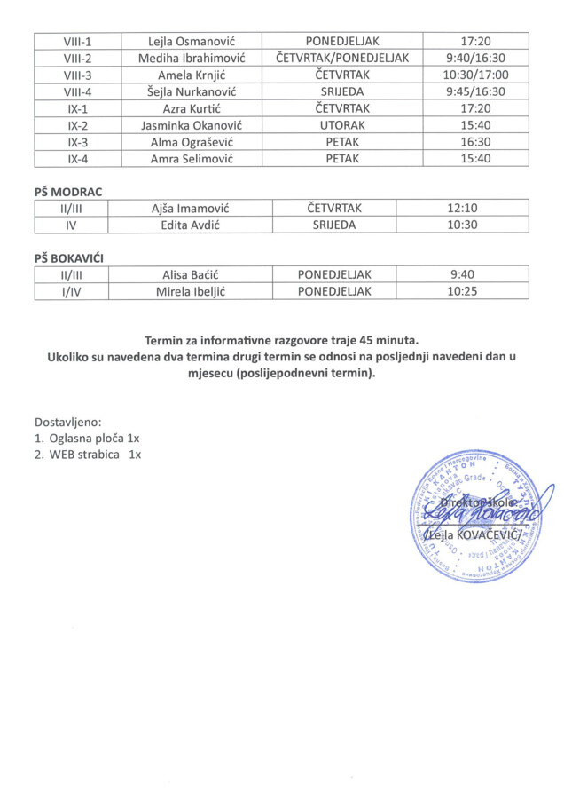 Raspored informativnih sastanaka za I polugodište 2025/2026