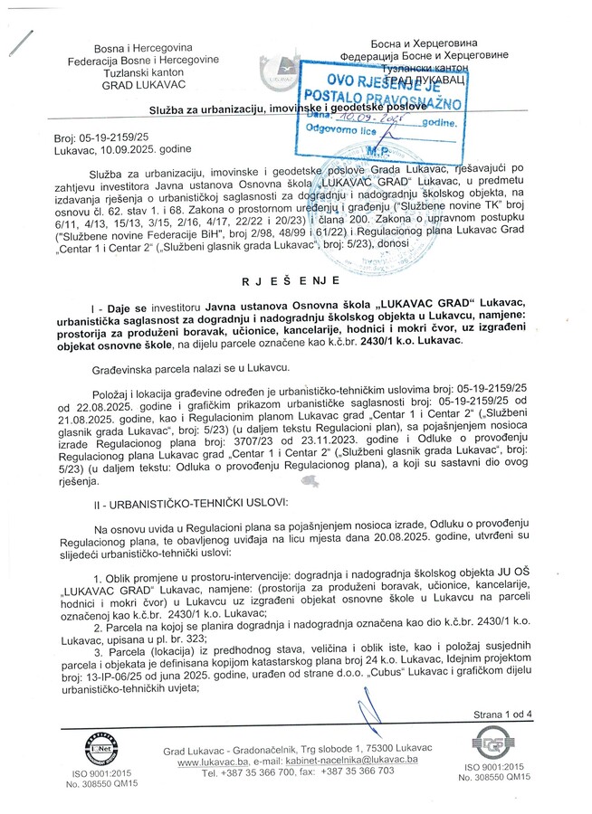 Danas je našoj školi uručeno Rješenje o davanju urbanističke saglasnosti za generacijski projekat dogradnje i nadgradnje školskog objekta.
